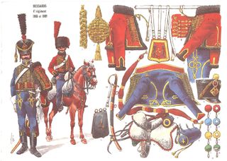 - Angļu huzāru ietērps Napoleona karu laikā, XVIII-XIX gs. mija. Mūsdienu zīmējums.