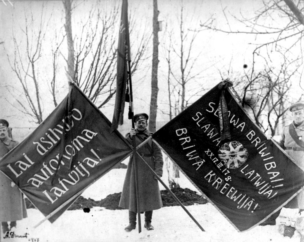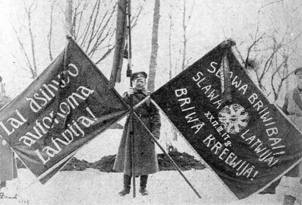 - 4. Vidzemes latviešu strēlnieku pulka strēlnieki ar karogiem Februāra revolūcijas upuru piemiņas demonstrācijas laikā.