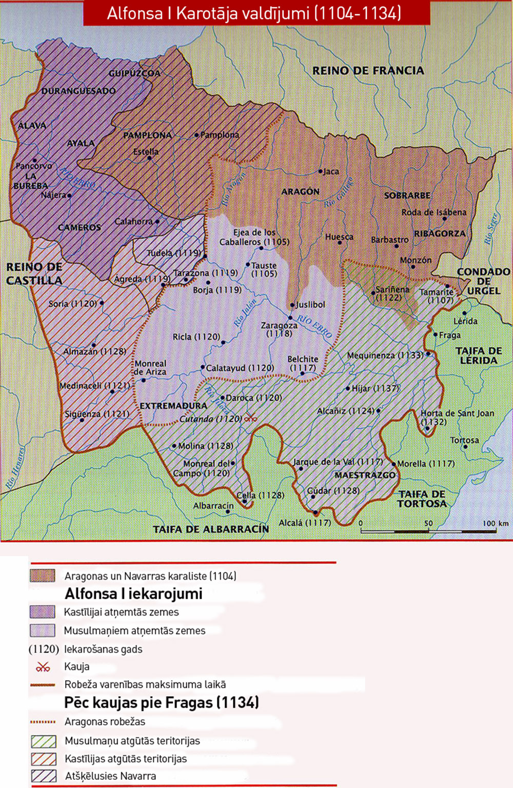 - Alfonsa I Karotāja (~1073-1134), Aragonas un Navarras karaļa valdījumu karte, mūsdienu rekonstrukcija.
