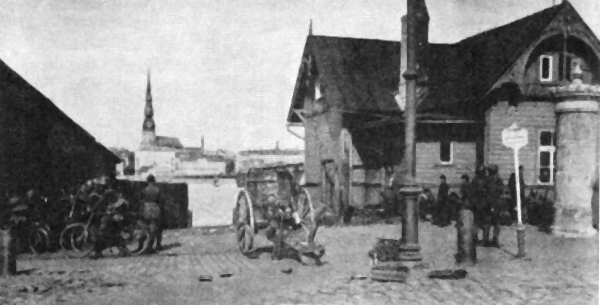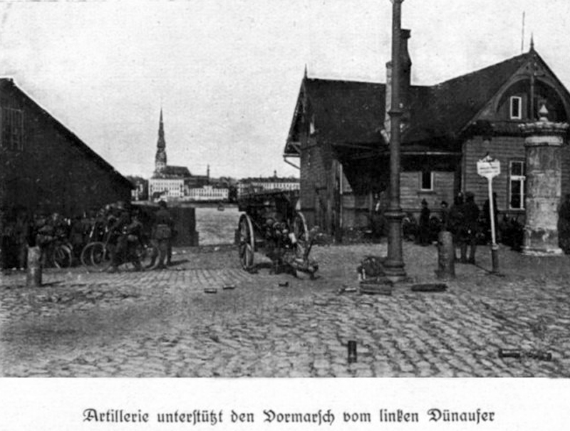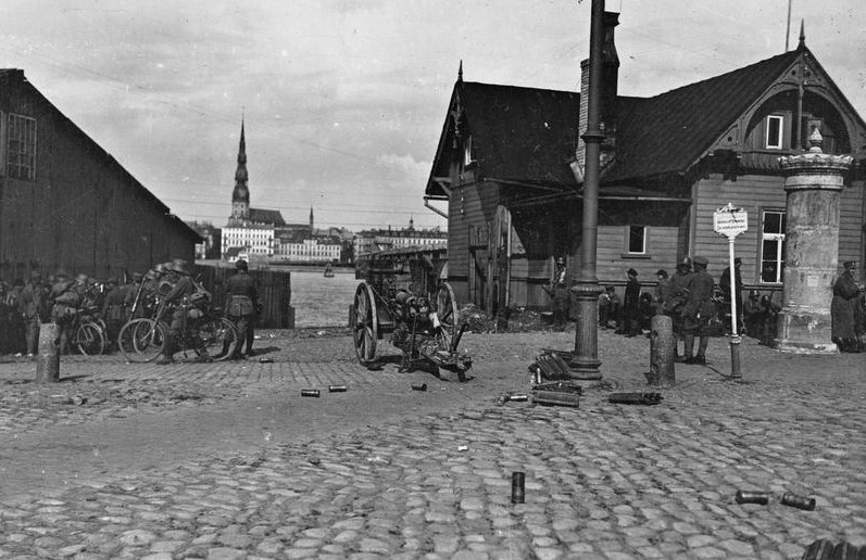 - Latvijas landesvēra artilēristi Rīgā, Pārdaugavā (Eine Batterie der Baltischen Landwehr am Dünaufer, links an der Schuppenwand gefangene Bolschewisten, bewacht von Leuten der Batterie Schlageter).