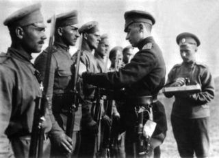 Kapteinis F.Briedis apbalvo 1. Daugavgrīvas bataljona strēlniekus par varonību jūlija kaujās. 1916. gada vasara.