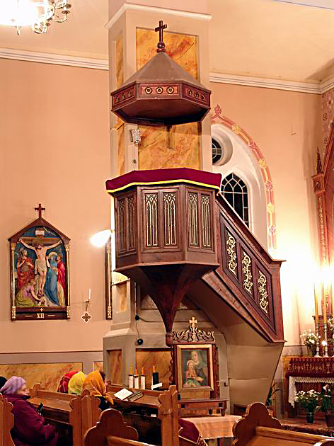 Kancele Pieniņu Jēzus Sirds katoļu baznīcā. Attēls no: Pieniņu Jēzus Sirds baznīcas iekšskats