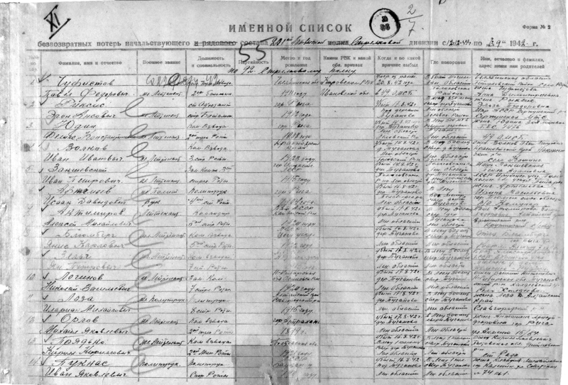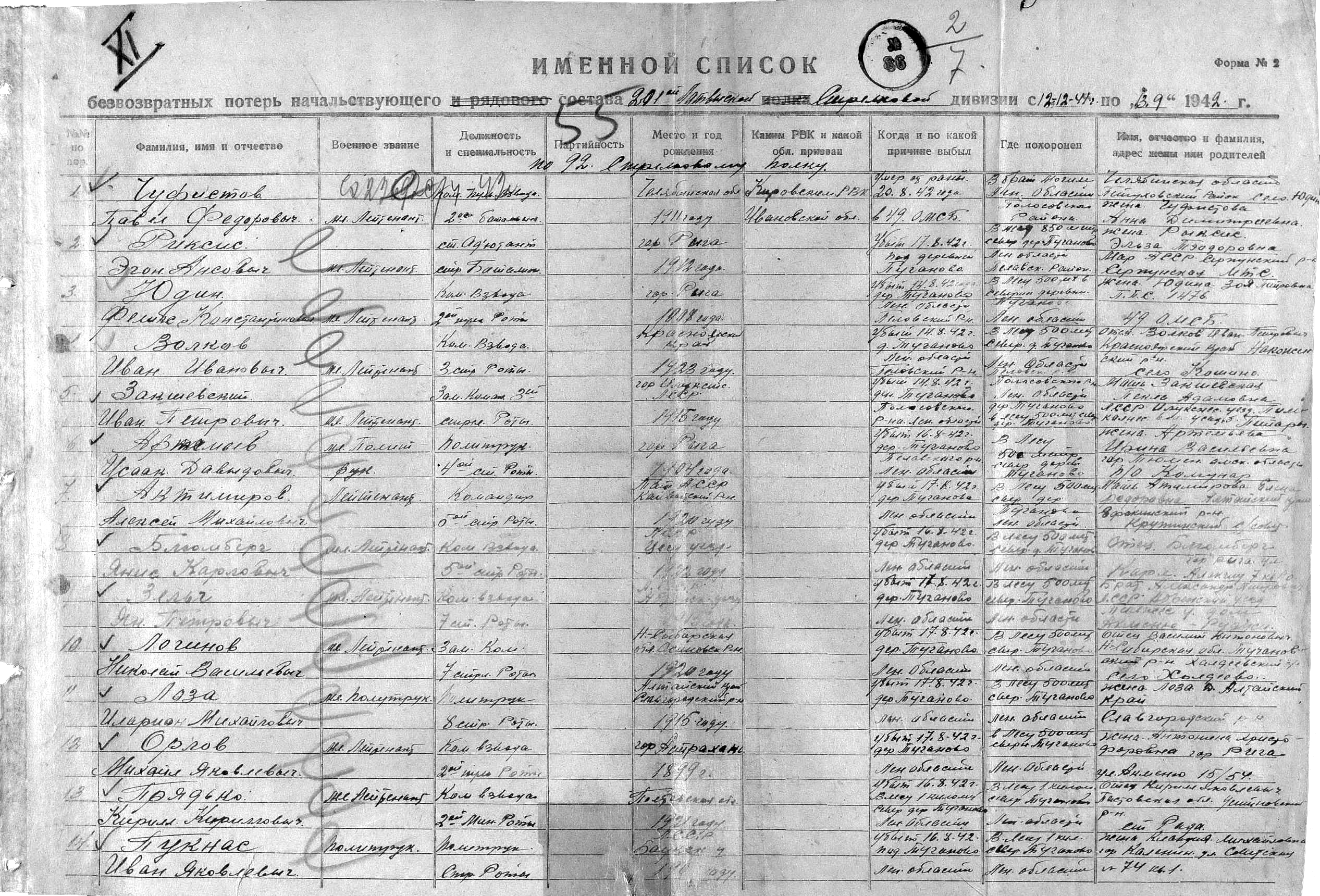 201. strēlnieku divizijas kritušo saraksts (fragments) 12.12.1941.-13.09.1942. Attēls no memorial.ru