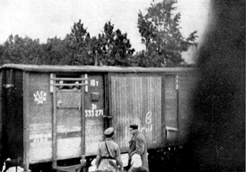 Latvijas iedzīvotāju deportācija 1941. gada 14. jūnijā. Fotogrāfijas autors nav zināms. Attēls no nacisma laika propagandas izdevuma "Baigais gads" (Rīga, 1942.)