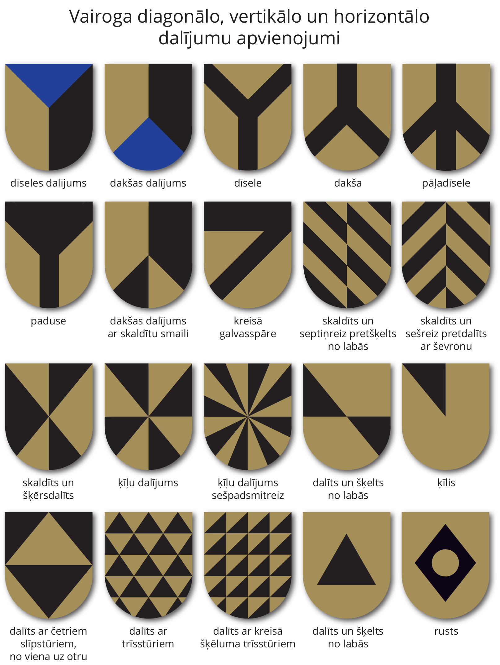 - Heraldiskā vairoga diagonālo, vertikālo, un horizontālo dalījumu apvienojumi.