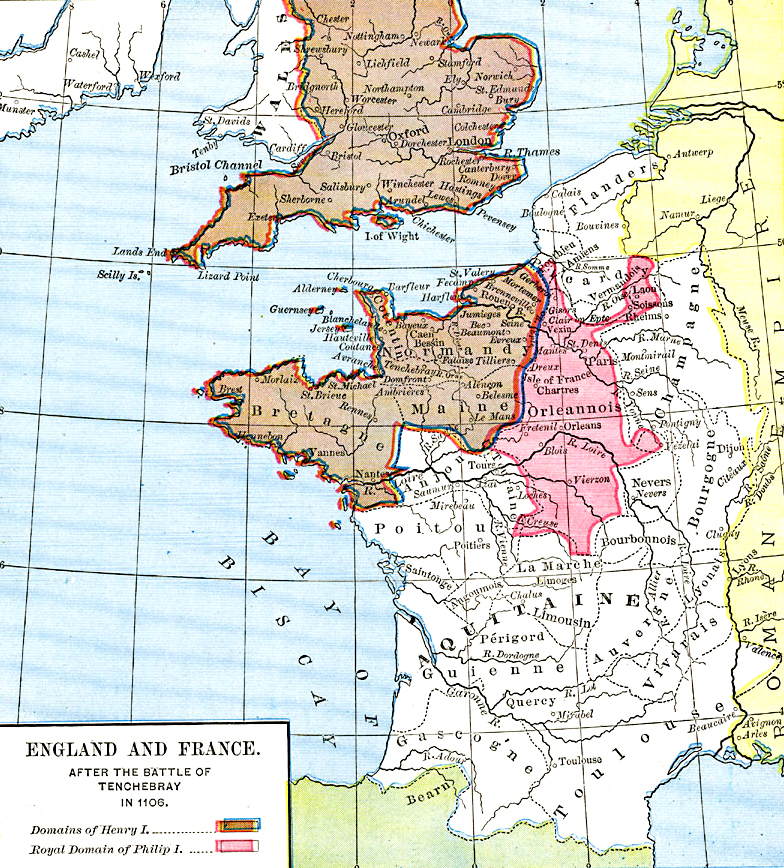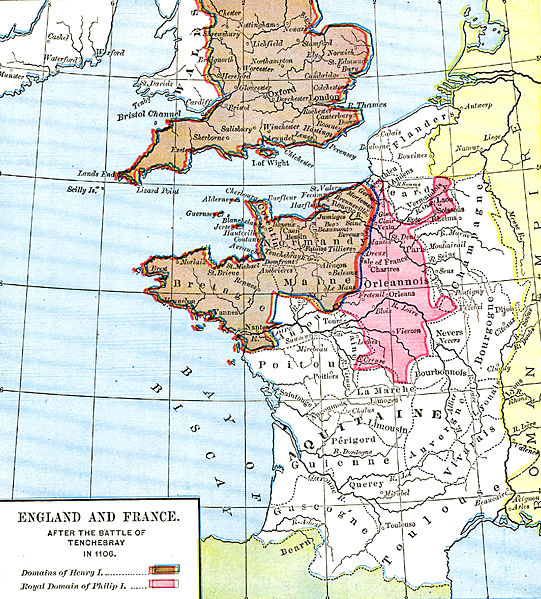 Anglijas un Francijas karaļu valdījumi ap 1106. gadu. Attēls no: http://etc.usf.edu/maps/pages/6800/6865/6865.htm