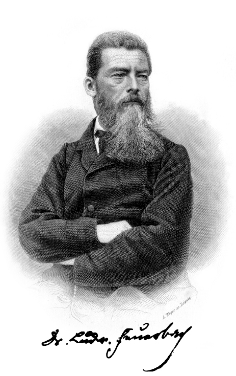 Ludvigs Andreass fon Feierbahs (Ludwig Andreas von Feuerbach, 1804.-1872.) - filosofs, antropologs. Avots: Ludwig Feuerbach's Philosophische Charakterentwicklung: Sein Briefwechsel und Nachlass 1820-1850 (Leipzig & Heidelberg: C. F. Winter'sche Verlagshandlung, 1874), frontispiece.