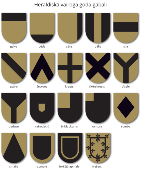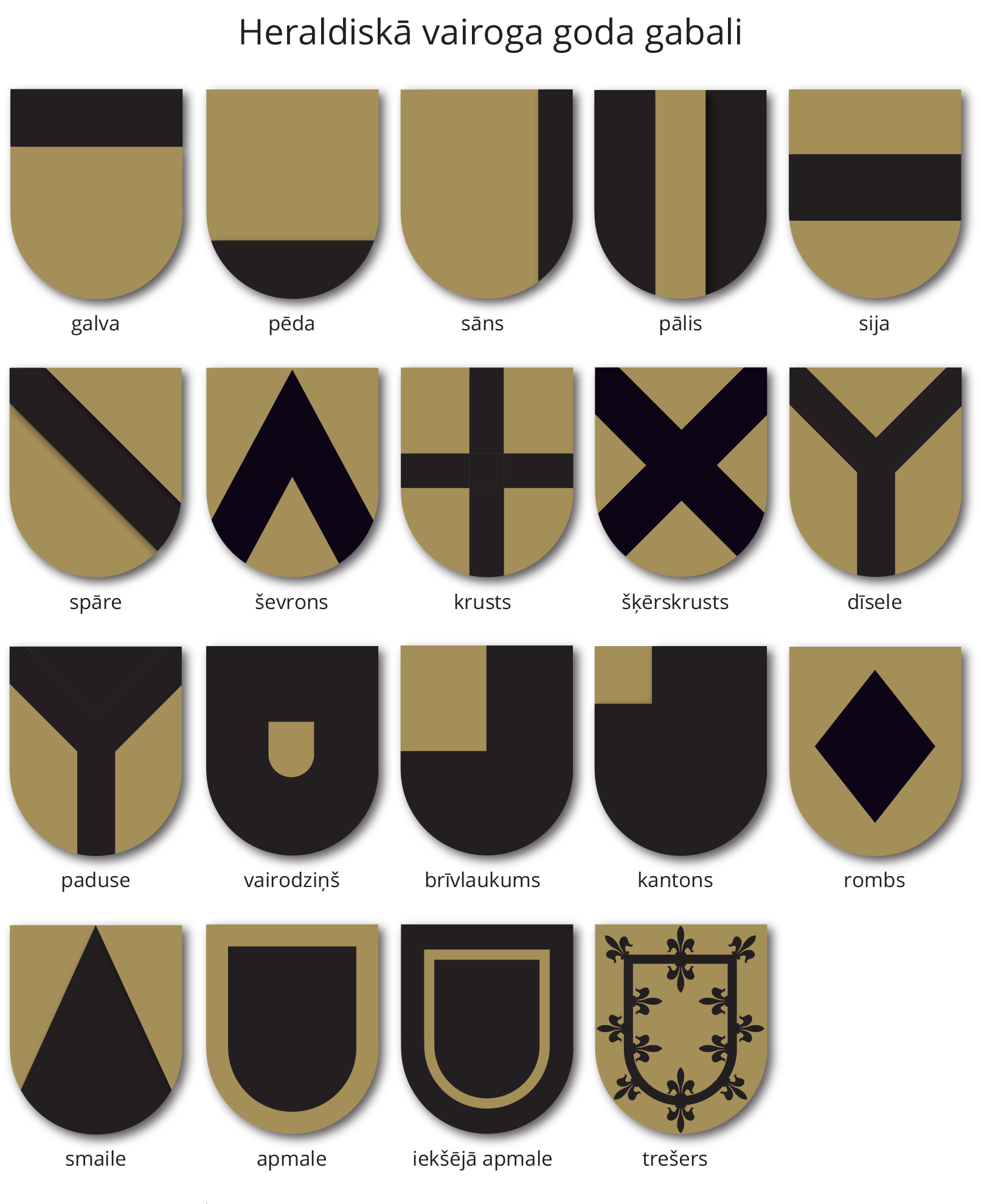 - Goda gabali (fr. pièces honorables, an. ordinaries, subordinaries, vc. Ehrenstücke, kr. почетные фигуры) – heraldiskā vairoga ģeometriskajos dalījumos iegūtas figūras, kuras laika gaitā ieguvušas no dalījumiem atsevišķus nosaukumus un nozīmīgumu.