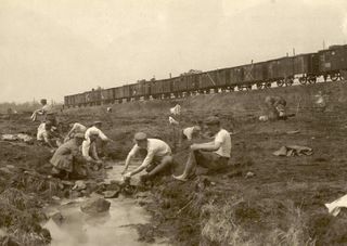 Troickas (1. atsevišķā Latvijas strēlnieku) kareivji īslaicīgā apieturā, veļas mazgāšana.