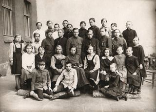 - Marija Aberbergs-Augškalns ar saviem skolēniem. Rīga, 4. vidusskola (pēc 2. Pasaules kara Marija strādāja par skolotāju Iecavā no 1950. līdz 1958. gadam).