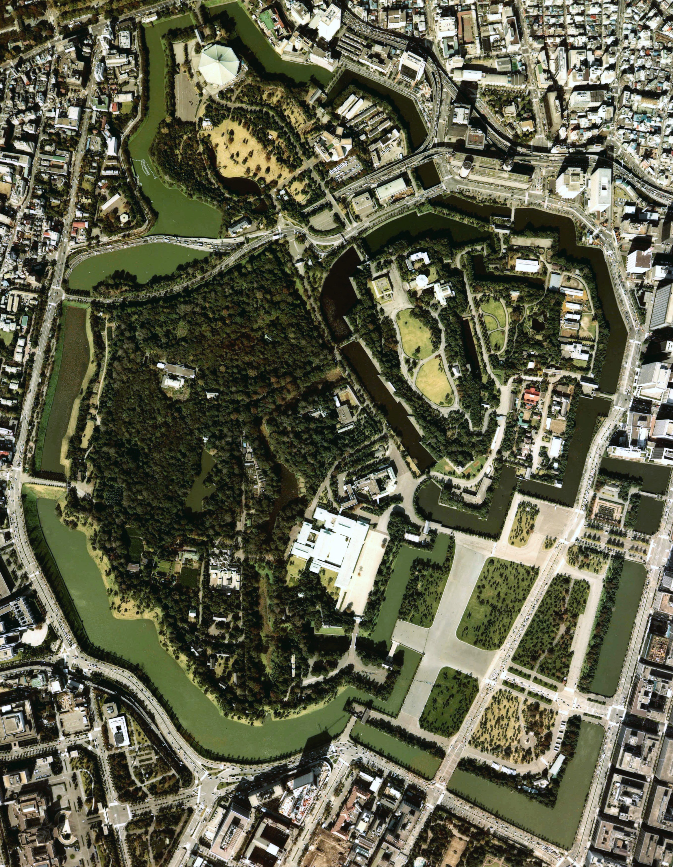 皇居付近の航空写真(現在の国土交通省による撮影。部分加工済み)画像上部が北になる。