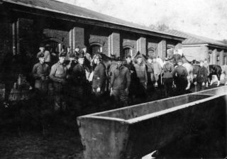 - Latvijas armijas 1. jātnieku pulka karavīri pie staļļiem, Daugavpils.
