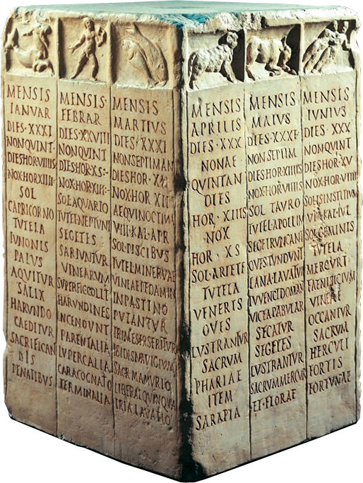 - Romiešu kalenda (an. Menologium Rusticum Colotianum). Uz katras šķautnes 3 mēneši, ar Zodiaka zīmi, mēneša nosaukumu un dienu skaitu, mēneša aizgādni dievību, lauksaimniecības darbiem optimālo laiku, kā arī dienas un nakts garumu, svarīgākajiem svētkiem.