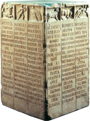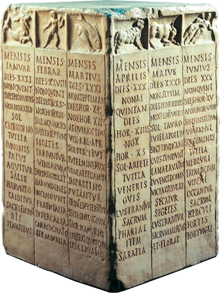| tagadējais | 2014. gada 24. novembris, plkst. 12.20 | 514 × 685 (953 KB) | Buks Artis (Diskusija | devums) | * Romiešu kalenda (an. ''Menologium Rusticum Colotianum''). Uz katras šķautnes 3 mēneši, ar Zodiaka zīmi, mēneša nosaukumu un dienu skaitu, mēneša aizgādni dievību, lauksaimniecības darbiem optimālo laiku, kā arī dienas un nakts garumu, sv |