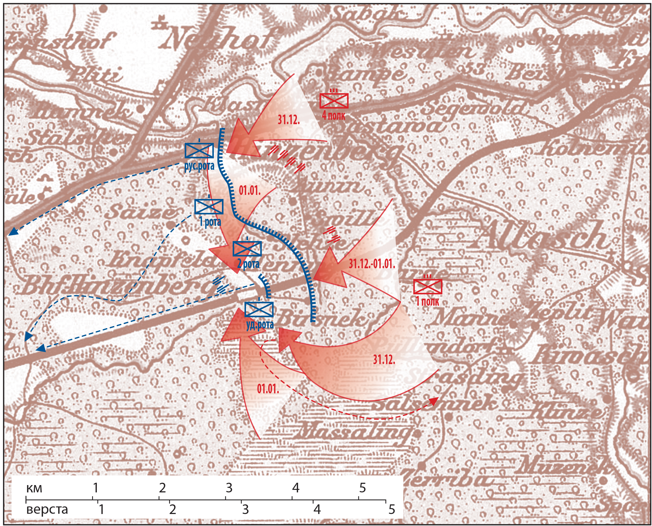 - Схема битвы 31.12.1918. у ст. Инчукалнс между частями ландесвера и полками красных латышских стрелков.