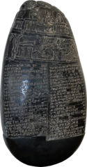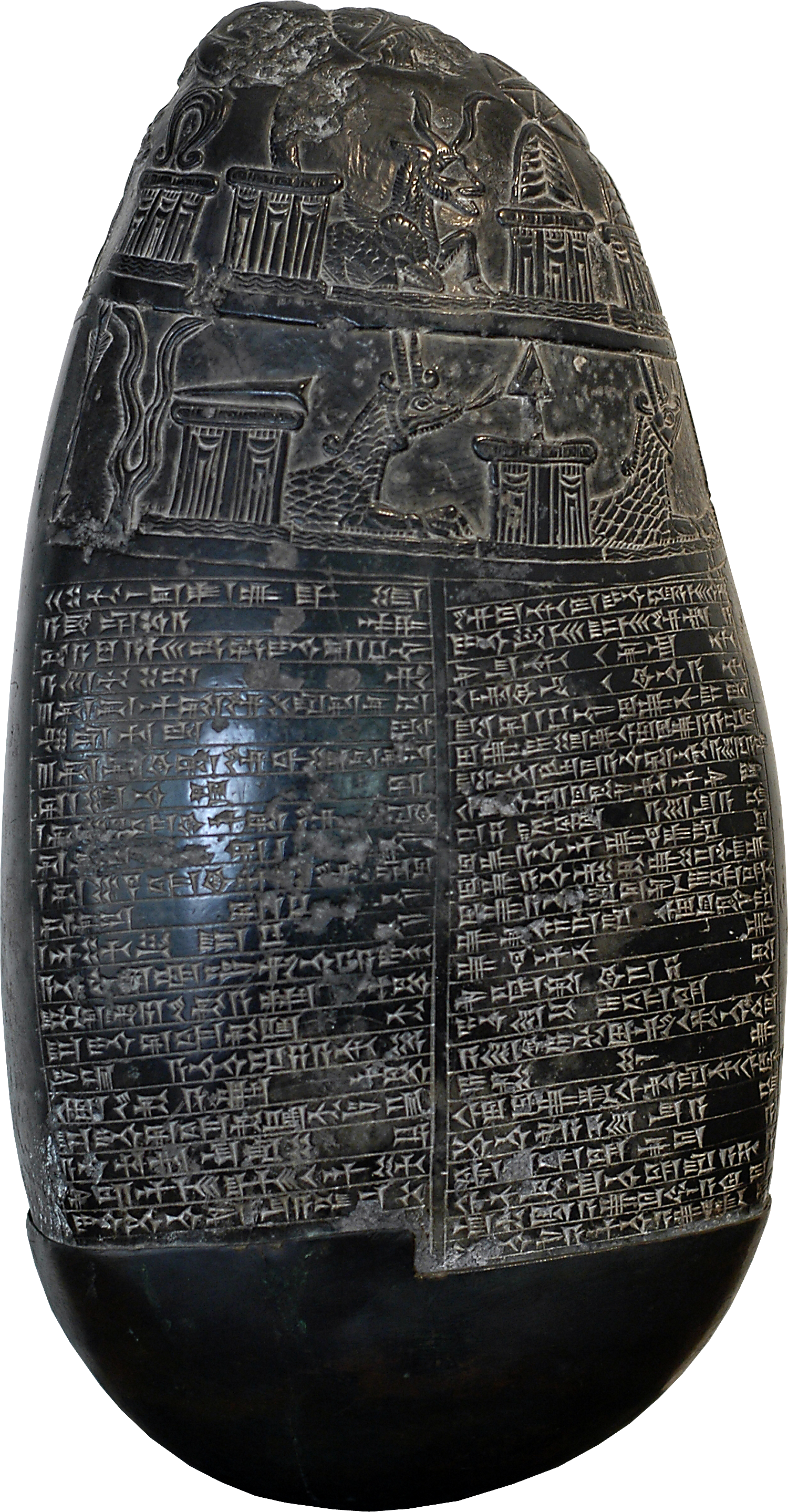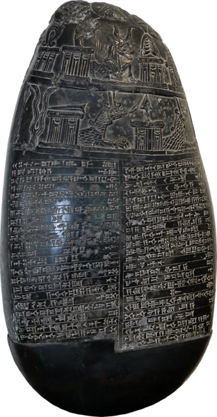 Babylonian kudurru of the Kassite Period, known as the "Michaux Stone". The stele bears an inscription (a property charter) in Akkadian script. Black serpentine, early 11th century BC, found near Baghdad in 1876 by the French botanist Michaux, hence the name. - Cabinet des médailles de la Bibliothèque nationale de France, Paris, France (Chabouillet no. 702).
