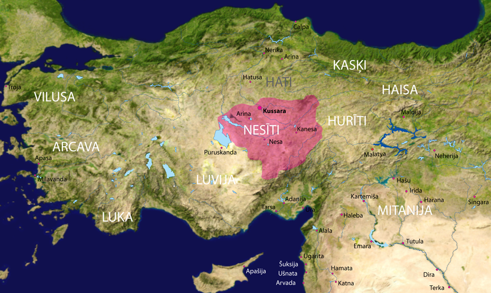Iespējamās Kusaras pilsētvalsts robežas XVIII gs.p.m.ē. Rekonstrukcija neprecīza (pati Kusaradažādās kartēs tiek lokalizēta visai dažādās, pat diametrāli pretējās vietās, savukārt vienā litaratūrā Nesa un Kaneša ir viens un tas pats, bet citur - divas dažādas pilsētas), jo neesmu vēl atradis pietiekami precīzus un autoritatīvus avotus, lai varē†u justies drošs, ka uz tiem var paļauties.