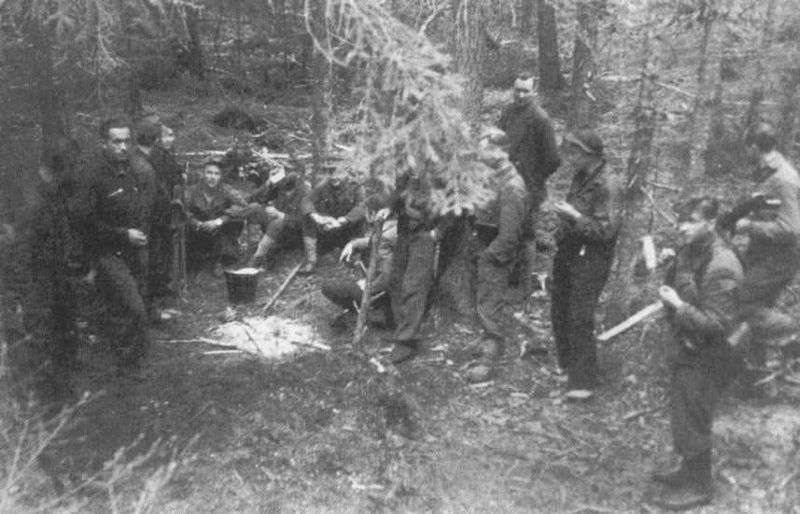 Kurzemes partizānu grupu pārstāvju sanāksmes dalībnieki Usmas mežu masīvā. 1946. g. septembris. Fotografējis LPSR IeM aģents M. Vītoliņš. TSDC arhīvs. Attēls ņemts no: http://students.mii.lu.lv/teo/vilki_vma/partizani.htm