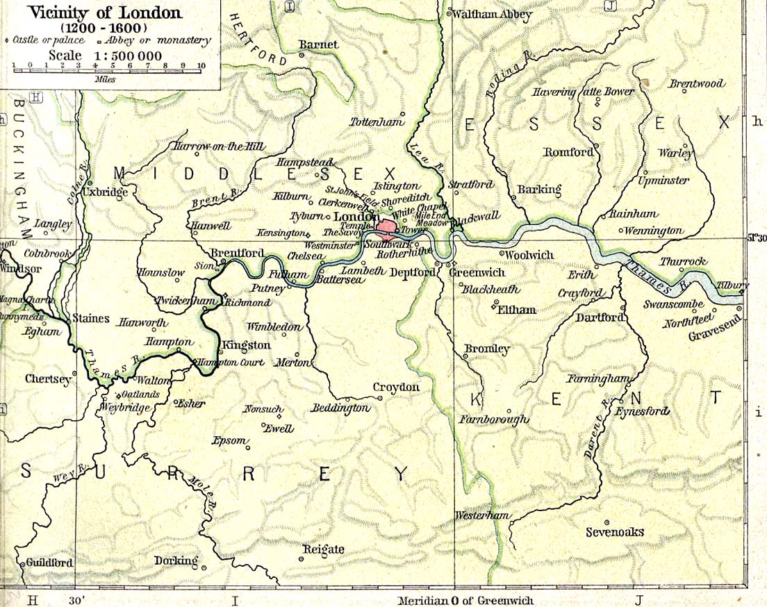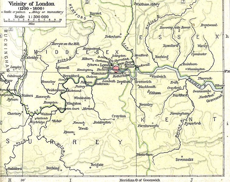 Londonas apkaime 1200-1600. g. Attēls no: http://www.lib.utexas.edu/maps/historical/shepherd/london_vicinity_1200_1600.jpg