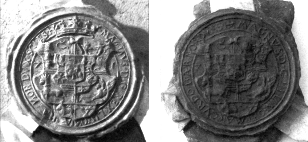 - Livonijas karaļa un Kurzemes bīskapa Magnusa ģerbonis zīmogos: kreisajā pusē karaļa ģerbonis, labajā pusē bīskapa ģerbonis.