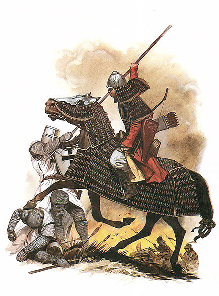 XIII gs. mongoļu smagais jātnieks kaujā pie Lignicas (1241.). Mūsdienu mākslinieka rekonstrukcija, par pamatu Karpini un Robinsona materiālu.
