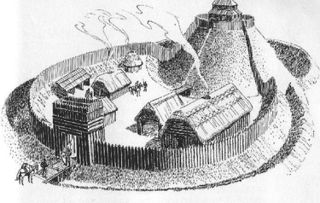 Ar palisādi nocietināta motes tipa mītne. Zīmējuma autors nav zināms, attēls no: http://img1.liveinternet.ru/images/attach/c/0//47/706/47706522_motte1.jpg