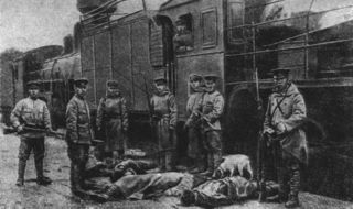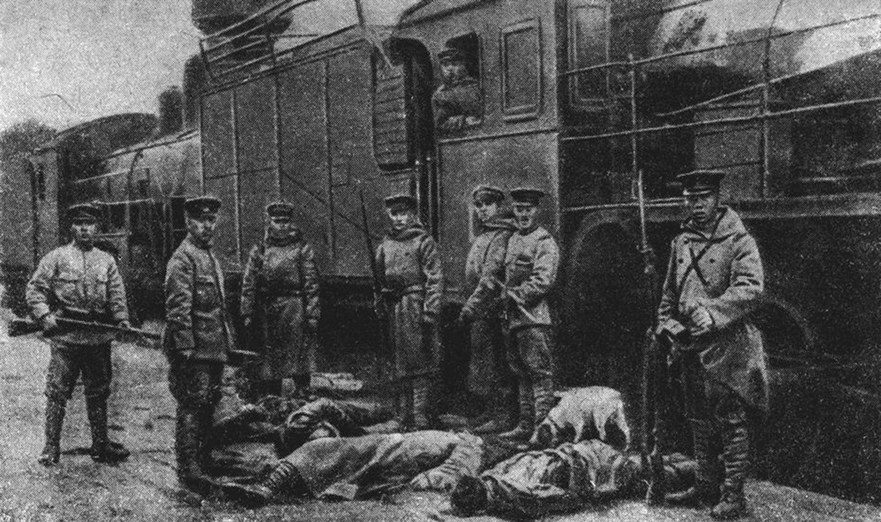 - Japāņu karavīri kādā nelokalizējamā dzelzceļa stacijā pie nošauto lielinieku(?) līķiem. / Japanese soldiers in a railroad station by the bodies of shot bolsheviks(?). Place and date un-known.