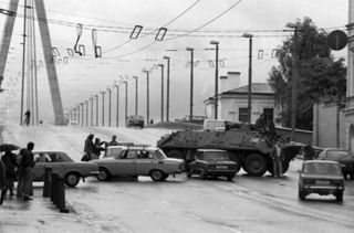 Rīgas pilsētas Iekšlietu pārvaldes īpašo uzdevumu milicijas vienība (kr. Рижский ОМОН) bloķē Rīgā Vanšu tiltu 1991. gada augusta puča laikā. Foto: AFI No: http://www.apollo.lv/portal/life/articles/96626