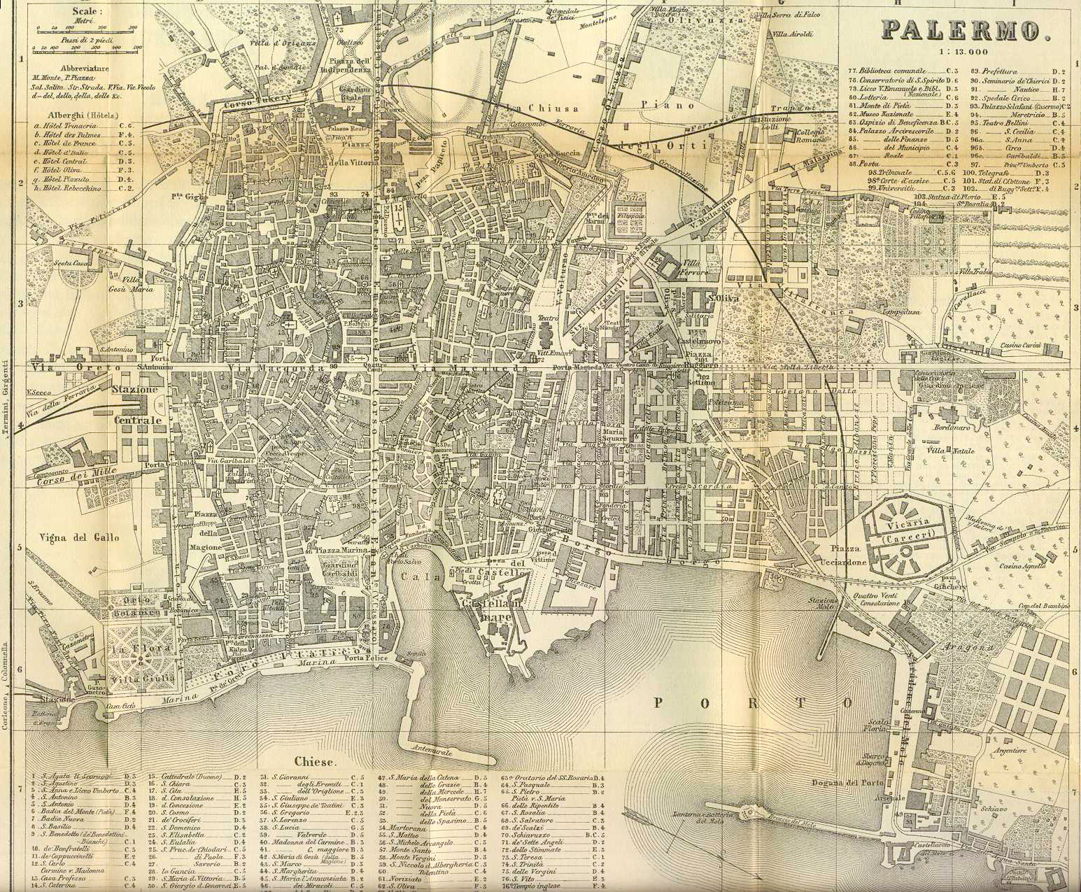 Palermo pilsētas plāns (1893.). Avots: http://freepages.genealogy.rootsweb.ancestry.com/~itasicily/maps/1893_Palermo.jpg