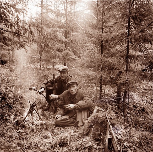 - Latviešu nacionālie partizāni Valdis Bebris („Šoferis") un Pēteris Tirzītis („Vecais") pie ugunskura. Gulbenes apriņķis.