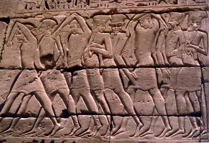 Sagūstītie filistieši - bareljefs Ramzesa III kapenēs Medinet-Abu.