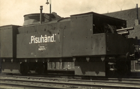 Igaunijas armijas bruņuvilciena Nr1 "Kapten Irv” artilērijas vagons "Pisuhänd" (Soomusrong Nr 1 "Kapten Irv” suurtükivaguni "Pisuhänd"). - The armoured train’s “Captain Irv” (Commander Captain Eduard Neps) platform called “Pisuhänd” for artillery guns.