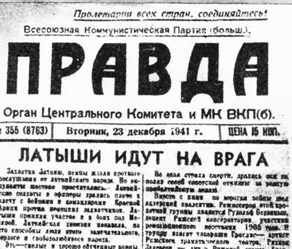 1941. gada 20.decembrī latviešu 201. strēlnieku divīzijas kaŗavīri devās pirmajā kaujā pie Maskavas. „Latvieši dodas pret ienaidnieku...” rakstīja "Pravda" (23.12.41.)