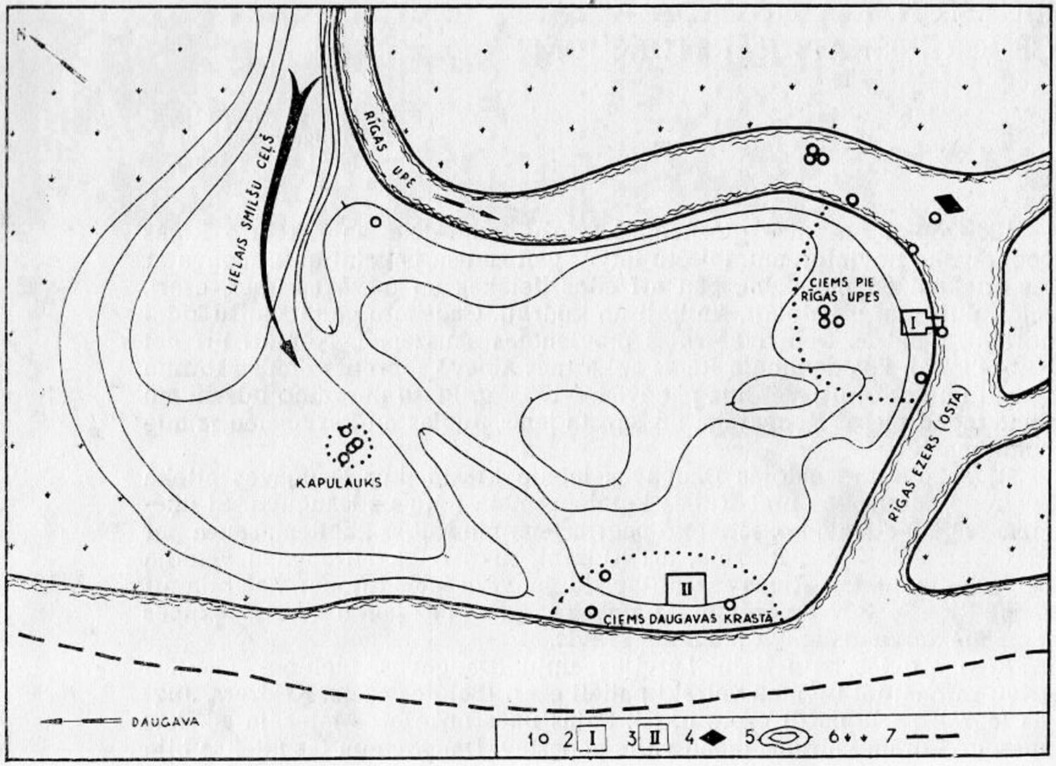 Rīgas vietas plānojuma rekonstrukcijas karte. 1 - XII gs. senlietu atradumu vietas; 2 - XX gs. 60.-70. gadu izrakumu vieta Alberta laukumā; 3 - XX gs. 70. gadu arheoloģisko izrakumu vieta Peldu un Ūdensvada ielu stūrī; 4 - Rīgas ostā nogrimušā kuģa vieta; 5- rekonstruētais zemes reljefs; 6 - pārplūstošās purvainās pļavas; 7 Daugavas krasts XXX gs. Avots: Feodālā Rīga. / red. T.Zeids - Zinātne: Rīga, 1978., 16. lpp.