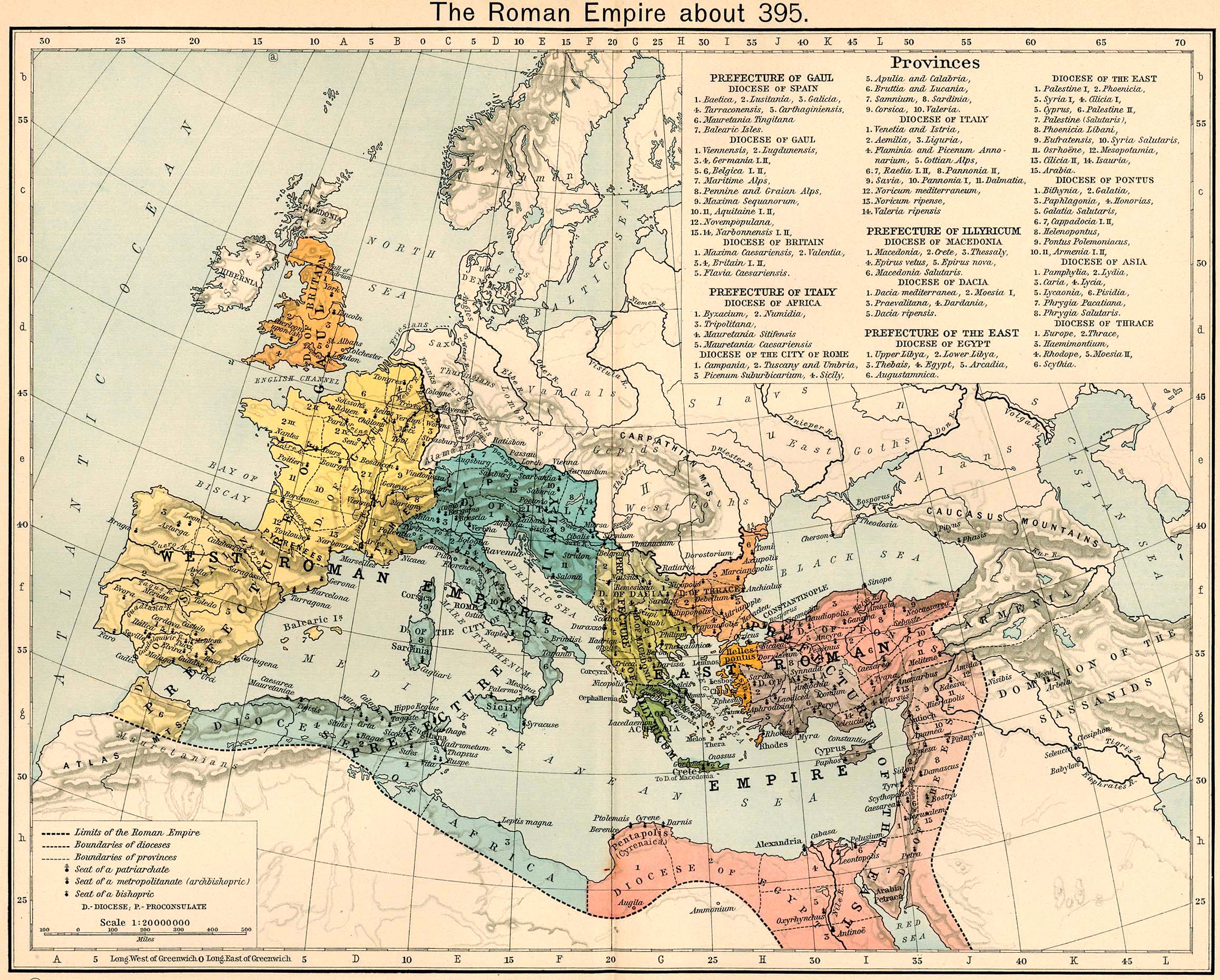 Romas valsts robežas 395. gadā. The Historical Atlas by William R. Shepherd, 1911.