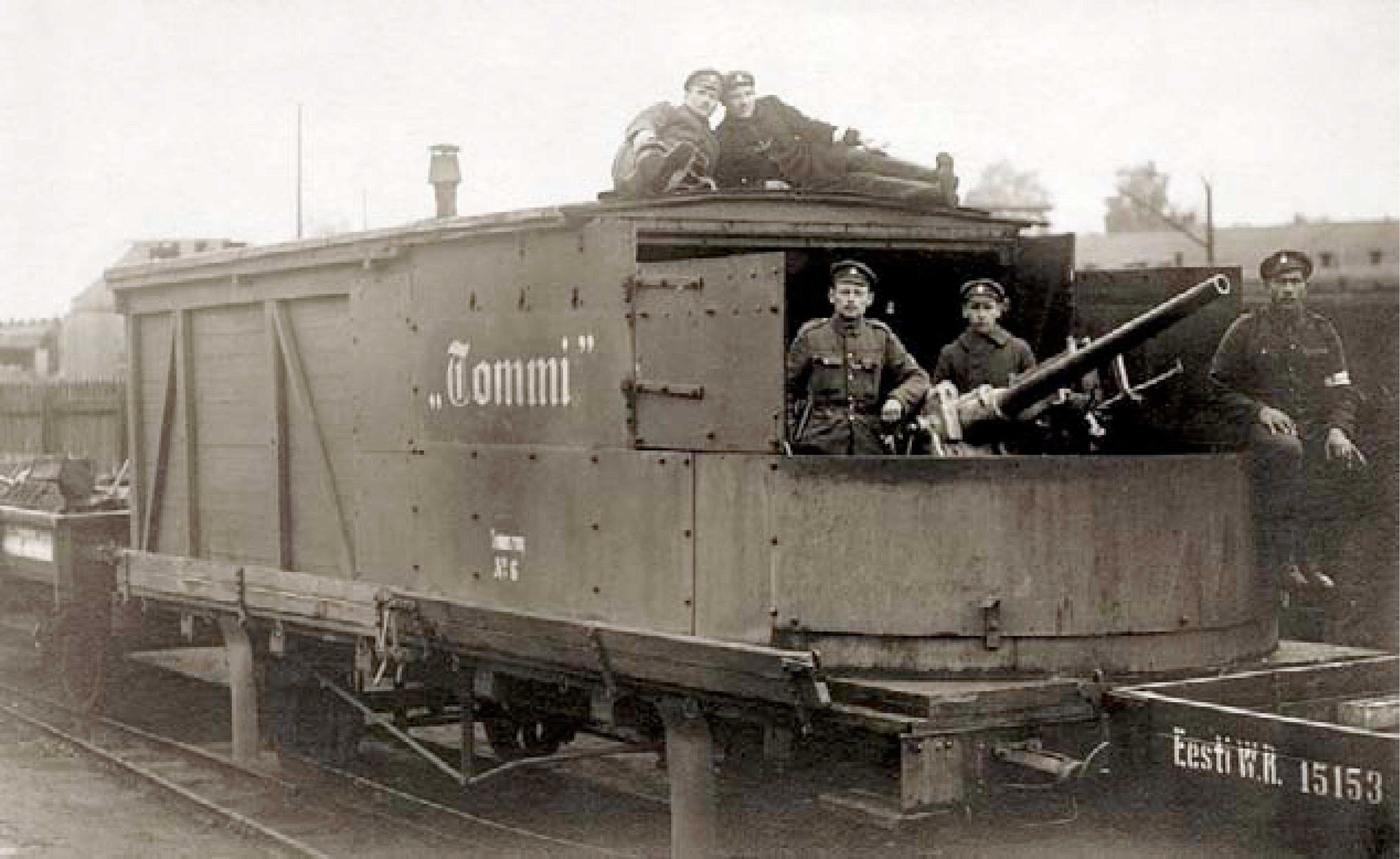 Igaunijas bruņuvilciens Nr 6 (Laiarööpmeline Soomusrong Nr. 6) artilērijas vagons "Tommi" ar 57 mm kuģa lielgabalu.