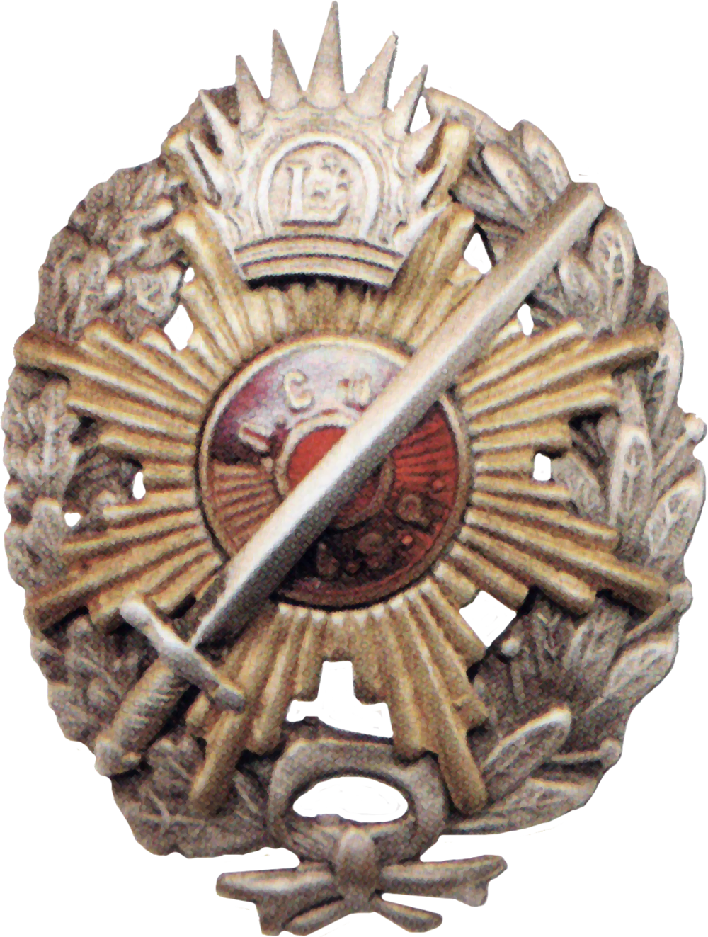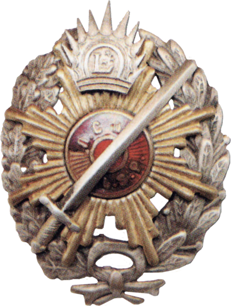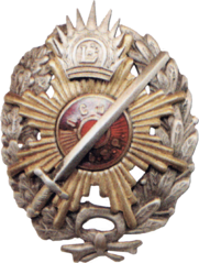 Latviešu strēlnieku pulku virsnieka krūšu nozīme ar vēlāk, Neatkarības kara laikā ērgļa vietā pielodētu sauli.