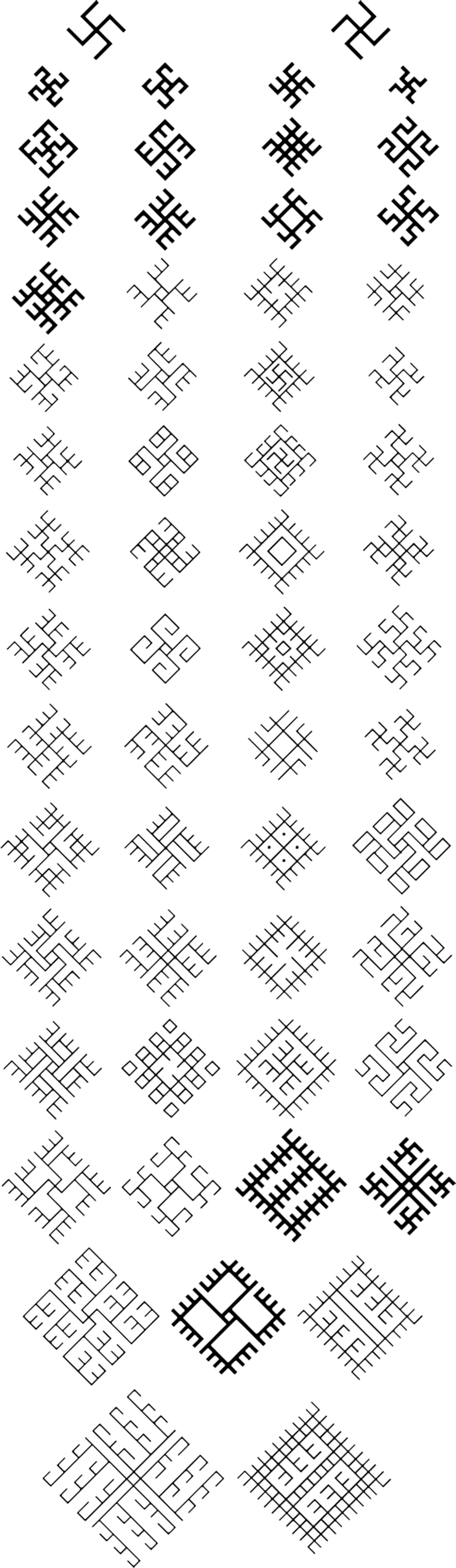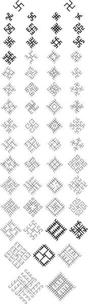 - Populārāko svastikas attēlojumu baltu (latviešu un lietuviešu) nacionālajā ornamentā apkopojums.