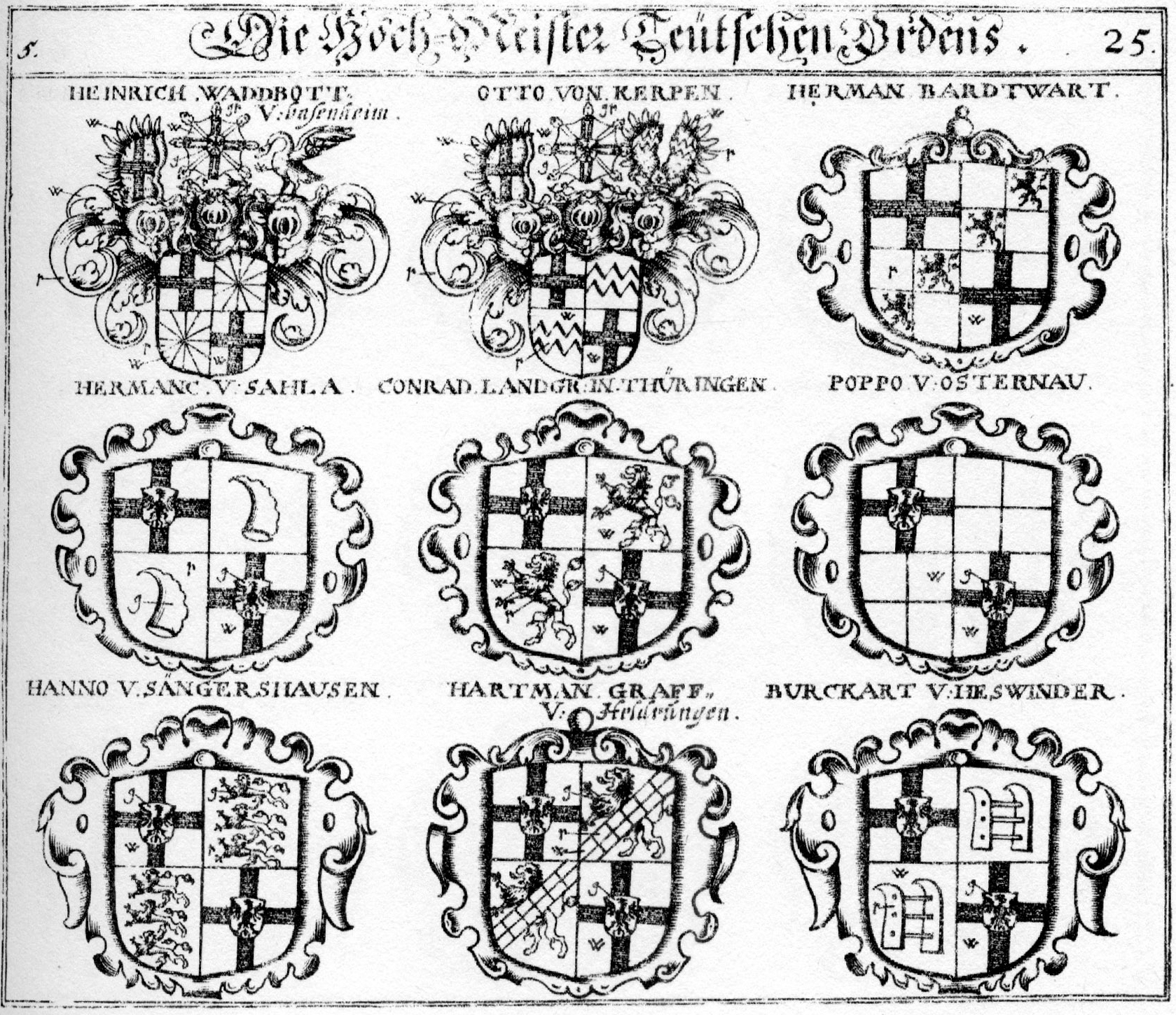 - XV gs. Vācu ordeņa lielmestru ģerboņi (dzimtas ģerbonis četrdalījumā ar ordeņa krustu sudraba laukā - krusts vienmēr izvietots pirmajā un ceturtajā laukumā).