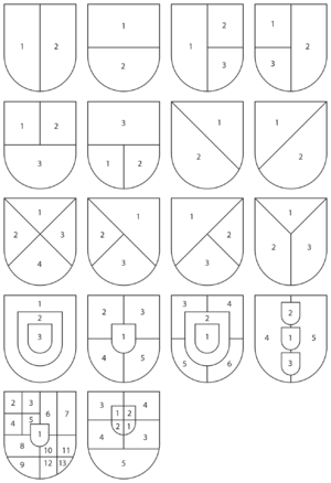 Ja vairogā apvienoti vairāki ģerboņi, blazonēšanu sāk ar labo malu un vairoga galvu (ja laukumi kārtoti horizontāli, tad aprakstu sāk ar labo augšējo stūri, bet ja vertikāli, tad aprakstu sāk no vidus uz labo malu, un tad uz kreiso malu). Monarhu un valstu ģerboņos, kas var ietvert daudzu valdījumu vai dzimtu ģerboņus, standarta secība netiek ievērota, jo jāņem vērā katra atsevišķa laukuma senums un nozīmīgums. Tāpēc ģerboņu laukumus grupē t.s. klasēs, veidojot grupas un veicot numerāciju katras klases ietvaros, tad pārejot pie nākošās grupas (šāds, piemēram, bija Austroungārijas 62 lauku ģerbonis) – šajos gadījumos blazonēšanu sāk ar sirds vairogu. Ja lietoti vairāki sirds vairogi, secību veido vairoga lauku hierarhija: sāk ar sirds vietu kā svarīgāko no goda apgabaliem, tad seko galva, tad naba. Vienkāršākos gadījumos vidus vairogu un sirds vairogu blazonē pēc pamatlaukuma apraksta.