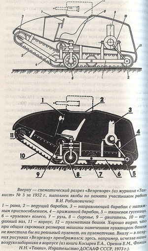 Toties mītu par pasaulē pirmo tanku atdzīvināja un attīstīja PSRS propaganda ar patriotisko saukli „Krievija ir tanku dzimtene!“[17] 1942. gadā O. Drožins savā grāmatā min, ka „jau 1914. gada augustā tika izstrādāts kāpurķēžu visurgājēja projekts“[18], bet jau 1946. gadā grāmatā „Tanks“[19] raksta par „kāpurķēžu kaujas mašīnas projektu“ un piemin Porohovščikova uzvārdu. Savukārt 1949. gadā savā publikācijā žurnālā „Tankists“ P. Korņušins jau apgalvoja, ka „Porohovščikova uzbūvētais kaujas mašīnas prototips bija pasaulē pirmais tanks“.[20] 1952. gadā Terentjevs un Bulajevs pat nepaslinkoja sameklēt aculieciniekus, un publicēja pirmo visurgājēja shematisko rekonstrukciju.[21] Par visurgājēja parametriem līdz šim spriests tikai no šīs pēc strādnieka V. Rabinoviča (В.И. Рабинович) atmiņām izveidotas aptuvenas visurgājēja šķērsgriezuma shēmas un pāris fotogrāfijām, kas tapušas izmēģinājumu laikā.