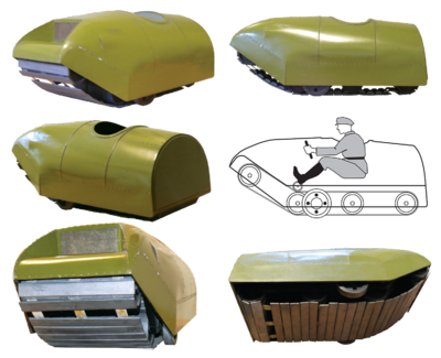 Uz līdzena ceļa pret grunts virsmu balstījās tikai kāpurķēdes aizmugurējā daļa (priekšējā daļa leņķī piepacelta slīpā leņķī), bet uz mīksta zemes seguma riteņi tajā iegrima, svaru pārnesot arī uz kāpurķēdes priekšējo daļu. Platā kāpurķēde ievērojami samazināja īpatno spiedienu uz grunti līdz 0,05 kg/m2 un neļāva mašīnai iestigt dubļos. Aizmugurējā velkošā ass ievietojās īpašās rāmī izfrēzētās ligzdās un tika fiksēta ar speciālām skrūvēm, kuras regulējot, ticis regulēts kāpurķēdes spriegojums (bez tam bijusi vēl speciāla kāpurķēdes augšējās cilpas spriegošanas ass). Pagriešanos veica ar pie priekšējās ass izvietotu 2 riteņu palīdzību, kurus grozīja 10-15° leņķī ar klasiskā automobiļa stūres mehānisma palīdzību. Nekādas bruņas vai ieroči projektā nebija paredzēti.[6]
