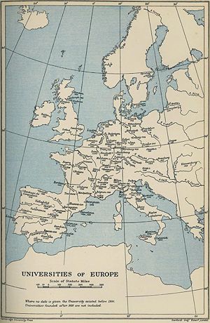 | + | [[Attēls:Europe_universities_before_1300.jpg|right|thumb|300px|Universitātes Eiropā pēc 1300. gada.]] | ||