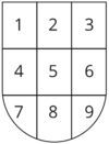 - Trīs vidū esošie laukumi viens virs otra (2, 5, 8) kopā veido pāļa vietu (vc. Pfahlstelle, kr. место столба, в столб).