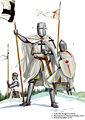 - seržanti - baltas tunikas un, iespējams, pelēkas mantijas ar kreisajā pusē uz pleca uzšūtu melnu "T" veida krustu;