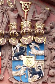 | 2009. gada 9. marts, plkst. 07.15 | Wappen Kurland i Bad Homburg.jpg (fails) | 217 KB | Wappen Kurland (Das Schloß in Bad Homburg vor der Höhe): Der Kurländer Hauptschild ist geviert, Feld 1 und 4 zeigen den kurländischen Löwen, Feld 2 und 3 zeigen einen Elch. Der Herzschild (Ketteler) zeigt eine Falle/Kesselhaken mit den ineinander ver | 1 | |